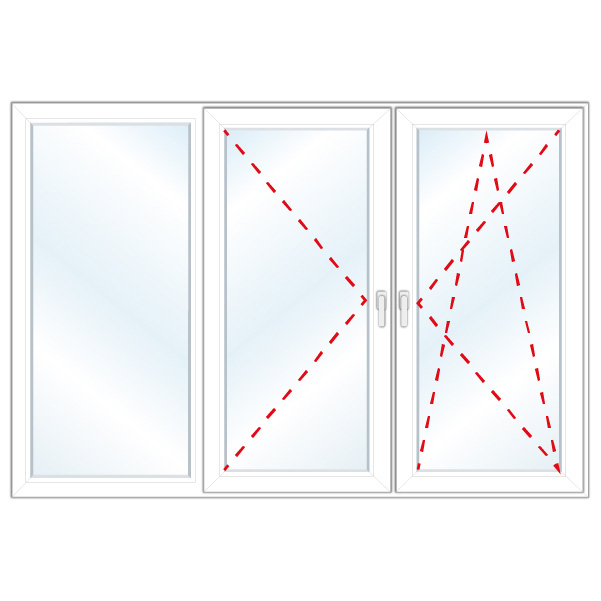 OKNO TRZYSKRZYDŁOWE, LEWE NIEOTWIERALNE, SZKLONE BEZPOŚREDNIO W RAMIE, ŚRODKOWE ROZWIERNO-UCHYLNE W PRAWĄ STRONĘ, PRAWE NIEOTWIERALNE, SZKLONE BEZPOŚREDNIO W RAMIE.