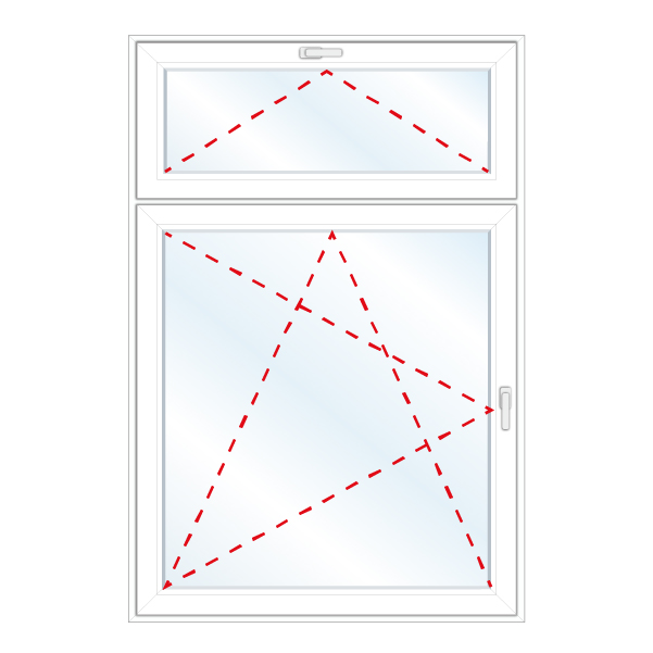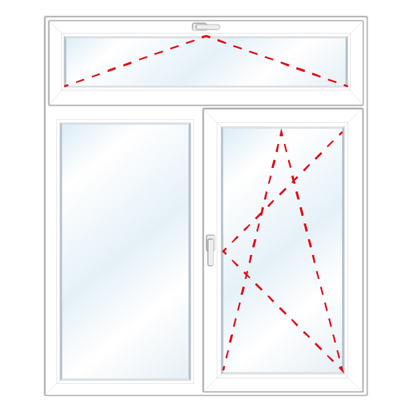 OKNO DWUSKRZYDŁOWE, LEWE ROZWIERNO-UCHYLNE W LEWĄ STRONĘ, NADSTAWKA UCHYLNA SZKLONA W SKRZYDLE, PRAWE NIEOTWIERALNE, SZKLONE W RAMIE, NADSTAWKA UCHYLNA SZKLONA W SKRZYDLE.