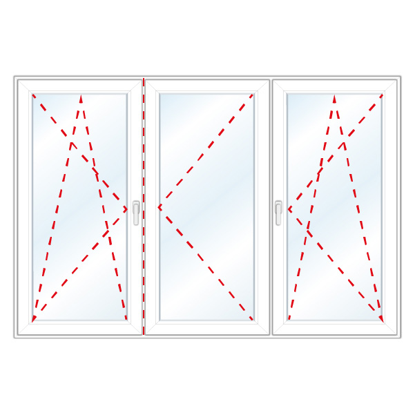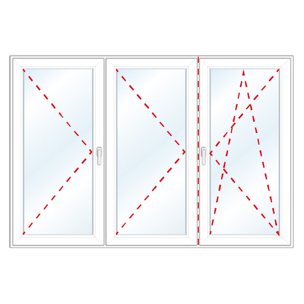 OKNO TRZYSKRZYDŁOWE, LEWE ROZWIERNO-UCHYLNE W LEWĄ STRONĘ, ŚRODKOWE ROZWIERNE W PRAWĄ STRONĘ, SŁUPEK RUCHOMY, PRAWE ROZWIERNO-UCHYLNE W PRAWĄ STRONĘ.