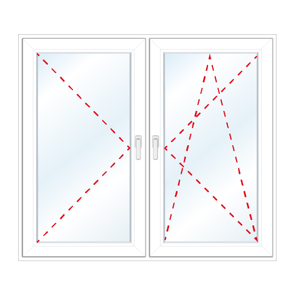 OKNO DWUSKRZYDŁOWE, LEWE ROZWIERNO-UCHYLNE W LEWĄ STRONĘ, PRAWE, ROZWIERNE W PRAWĄ STRONĘ, NADSTAWKA NIEOTWIERALNA SZKLONA BEZPOŚREDNIO W RAMIE, SŁUPEK RUCHOMY.