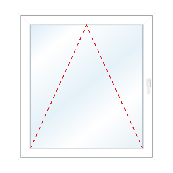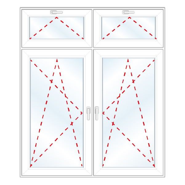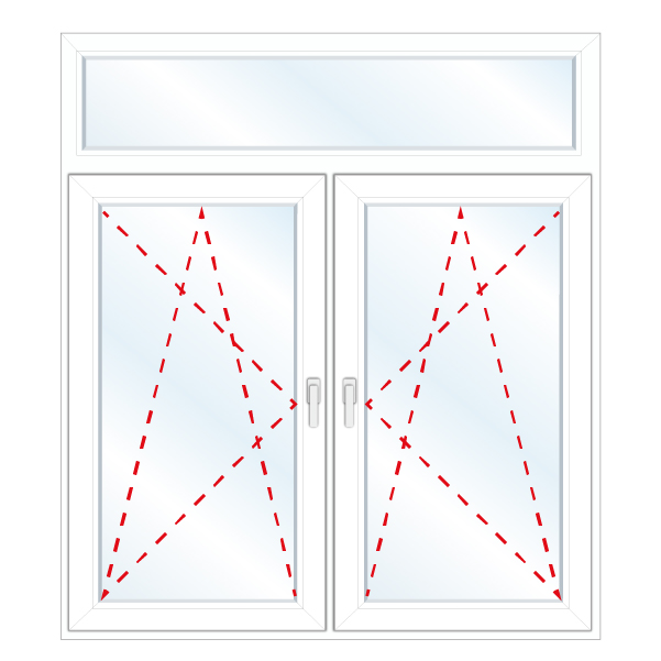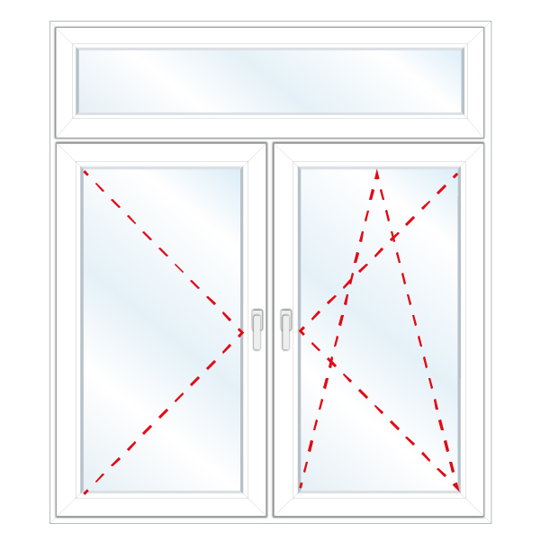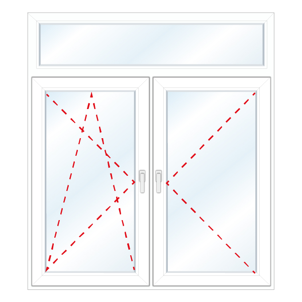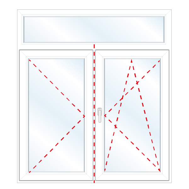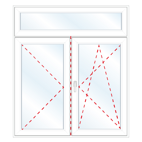 OKNO DWUSKRZYDŁOWE, LEWE ROZWIERNO-UCHYLNE W LEWĄ STRONĘ, PRAWE ROZWIERNO-UCHYLNE W PRAWĄ STRONĘ, NADSTAWKA NIEOTWIERALNA SZKLONA BEZPOŚREDNIO W RAMIE.
