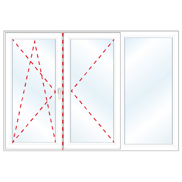 OKNO TRZYSKRZYDŁOWE, LEWE NIEOTWIERALNE, SZKLONE BEZPOŚREDNIO W RAMIE, ŚRODKOWE ROZWIERNE W LEWĄ STRONĘ, PRAWE ROZWIERNO-UCHYLNE W PRAWĄ STRONĘ, SŁUPEK STAŁY