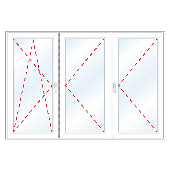 OKNO TRZYSKRZYDŁOWE, LEWE ROZWIERNO-UCHYLNE W LEWĄ STRONĘ, ŚRODKOWE ROZWIERNE W LEWĄ STRONĘ, PRAWE ROZWIERNO-UCHYLNE W PRAWĄ STRONĘ, SŁUPEK RUCHOMY.