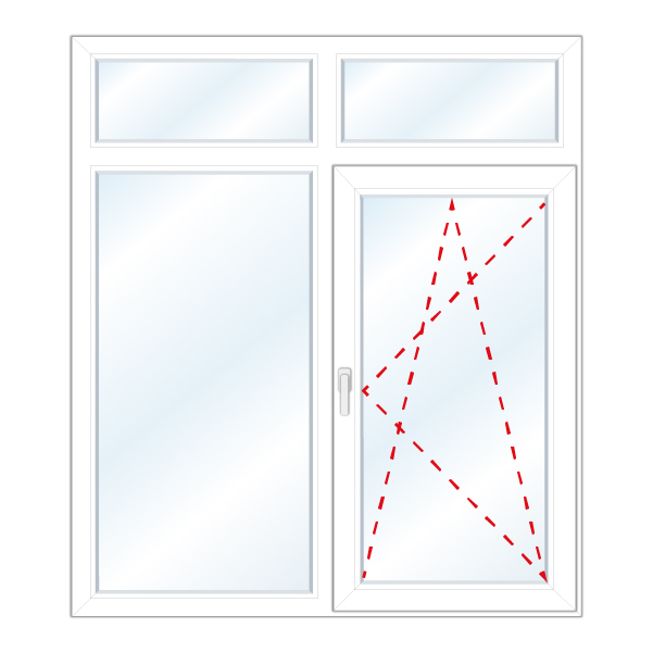 OKNO DWUSKRZYDŁOWE, LEWE NIEOTWIERALNE, SZKLONE W RAMIE, NADSTAWKA NIEOTWIERALNA SZKLONA BEZPOŚREDNIO W RAMIE, PRAWE ROZWIERNO-UCHYLNE W PRAWĄ STRONĘ, NADSTAWKA NIEOTWIERALNA SZKLONA BEZPOŚREDNIO W RAMIE.