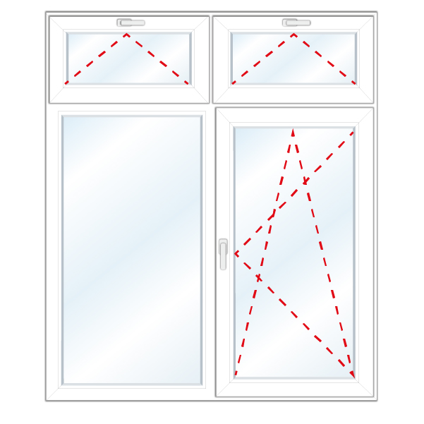 OKNO DWUSKRZYDŁOWE, LEWE NIEOTWIERALNE, SZKLONE W RAMIE, NADSTAWKA UCHYLNA SZKLONA W SKRZYDLE, PRAWE ROZWIERNO-UCHYLNE W PRAWĄ STRONĘ, NADSTAWKA UCHYLNA SZKLONA W SKRZYDLE.