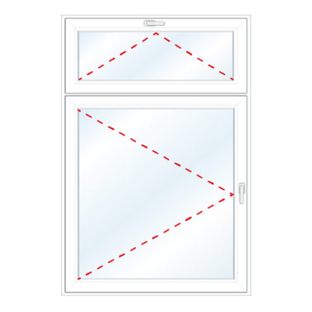 Okno rozwierne w prawą stronę, nieuchylne, nadstawka uchylna szklona w skrzydle.